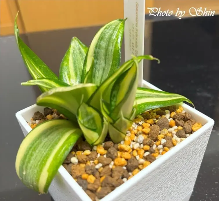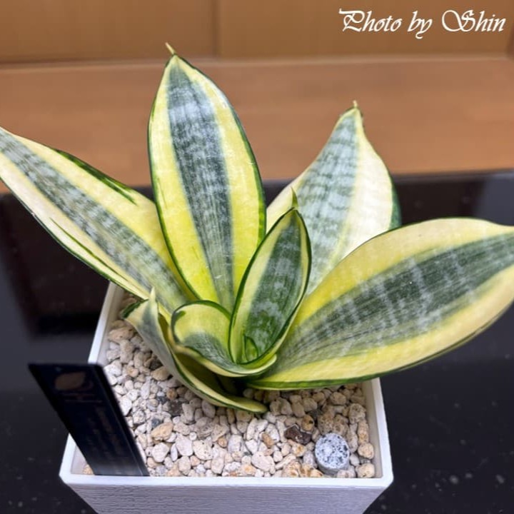 園芸家シルヴァン・ハーンにより発見され、1953年に米国植物特許第1224号が付与されたサンセベリアトリファスキアータの園芸品種で、鮮やかな黄色の斑が映える小型(~20㎝程度)の美種です。